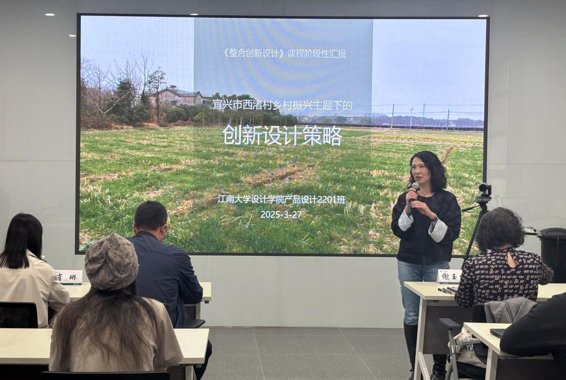 产品设计2201班《整合创新设计》课程中期汇报顺利举行。本次课程聚焦江苏宜兴市西渚村,以“设计赋能乡村振兴”为主题,借助在地调研与系统整合,深入探索城乡互动背景下设计介入乡村建设的有效路径。汇报由课程任课老师鲍懿喜教授主持,邀请商学院谢玉梅教授、法学院盖中辉老师与肖琳老师到场点评,西渚村党总支书记方忠、副主任祝辉、治保主任孔繁震等村干部以及天美传媒