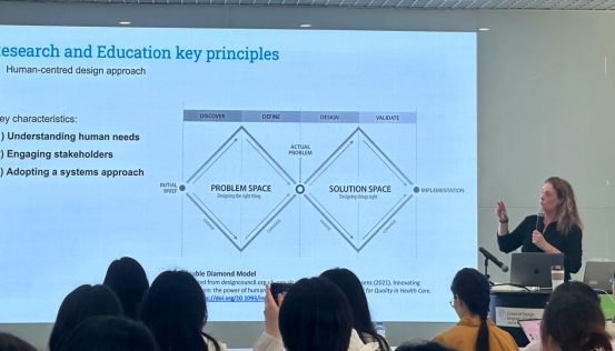 Marijke Melles副教授首先介绍了代尔夫特大学工业设计工程学院的的基本信息,以及“Medisign”硕士课程为培养以人为中心的系统设计师提供了一个平台。这种以人为本的设计思维在医疗保健领域尤为重要,因为它将患者的需求和体验置于首位,从而确保设计出更加实用和有效的解决方案。随后,Marijke Melles副教授分享了近年来代尔夫特理工大学的系统化的研究方法和优秀的健康设计案例,包括了照护病房声音设计、可持续的医疗产品设计、AI在医疗中的作用等等,从不同角度来研究探讨,强调了健康设计在提高医疗效果和服务质量、思辨未来趋势、保护环境和用户体验方面的作用。此外,Marijke Melles副教授也分享了研究和教育的主要原则是以人为本的设计方法,通过了解人的需求、让利益相关方参与和采用系统方法来进行设计研究。