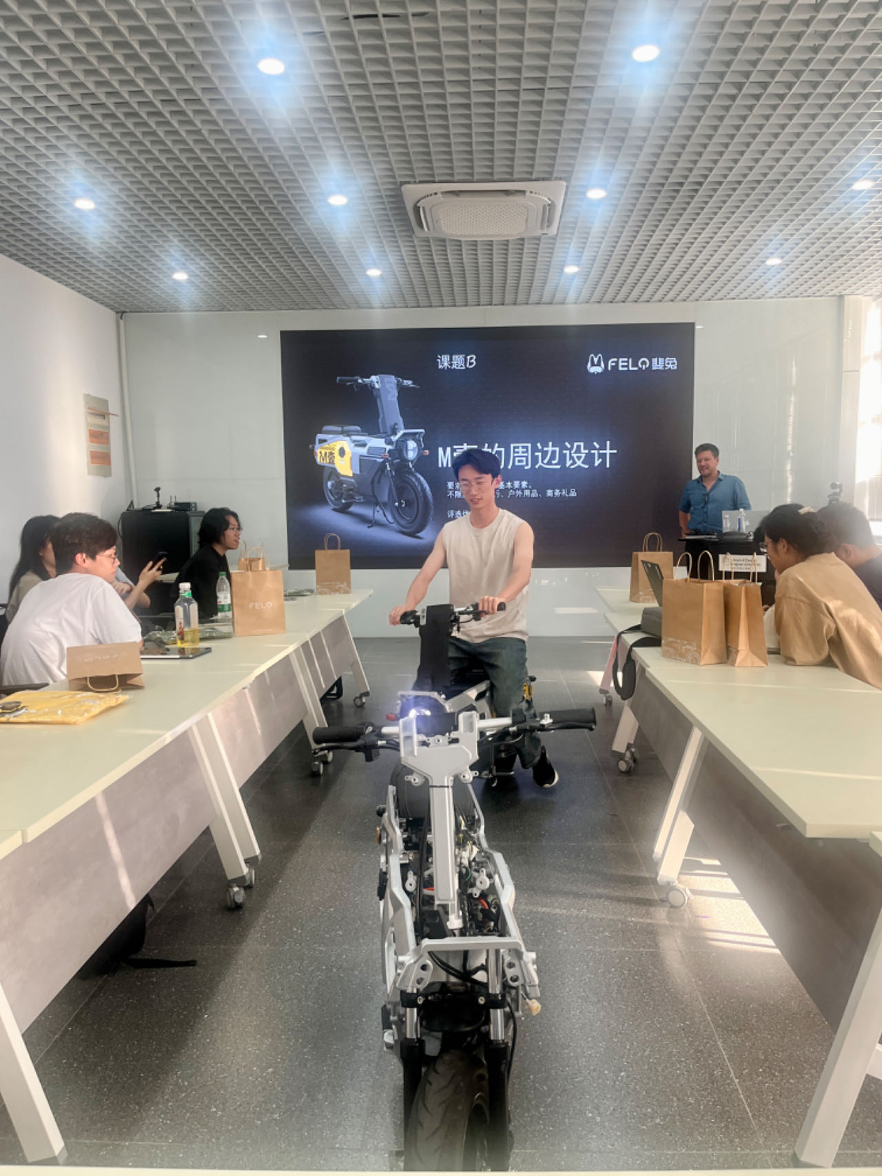 最后,设计学子结合视觉传媒、工业设计等专业学习实际,与张静毅先生一同探讨产品设计,并现场体验电斐公司的最新产品M壹电摩。学生们直观感受豪华纯电摩托产品。