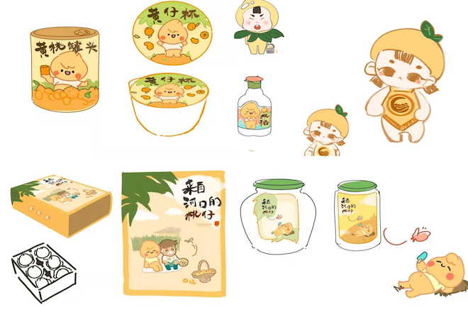 团队在出发前进行了充分的线上调研,在了解河口镇文化背景、地理环境、人文风貌等方面后,为河口古镇设计LOGO,并探索以河口卤菜、锦绣黄桃、码头蔬菜为特色的农副产品,进行产品包装设计和美化。