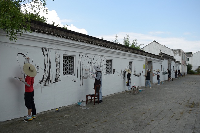 7月21日起至7月28日,“绘史传德”实践团队在吴冠中故居前开展了线下墙绘活动。实践期间历经台风“烟花”来袭,一天经历反复切换的“晴、阴、雨”多变天气,团队成员们一起克服烈日曝晒、蚊虫叮咬、交通不便等困难,用心绘制每一面墙,绘制总面积达223.1平方米。经过为期一周的实践,以铅笔在白墙勾勒轮廓开始,经过弹线、上色、塑造和题字等工序后,原本斑驳、陈旧的墙面被团队成员们成功改造,一组组简江南画作在光秃的墙壁上浮现,仿佛有了新的生命。实践团队的墙绘成果更是吸引了不少村民的驻足观看,甚至有在周边居住的青年,主动报名自愿加入实践活动。