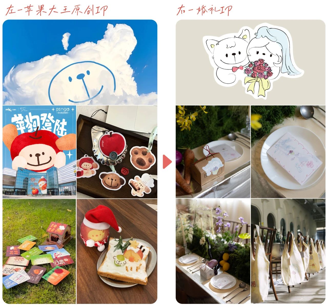 2025年樱花季,他们交出了最特别的设计作品——一只小狗与一只小猫的浪漫寓言。赵怡宁曾在研究生期间参与生活方式品牌“苹狗大王PingozZ”的创业设计项目,这次也获得品牌主理人授权,延续并发展了该品牌的原创IP形象。视觉主角——打领结的小狗(新郎)与手捧花的小猫(新娘),在丝带、蝴蝶结等柔美元素的陪衬下,共同组成了烂漫而富有童趣的主视觉画面。从请柬、席卡到现场布置,一整套定制婚礼视觉系统应运而生,为这场婚礼注入灵魂。