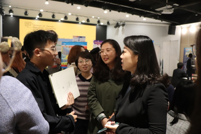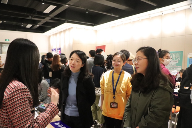 双选会期间,学院党委副书记王晖、分团委书记陆芳来到招聘现场,就设计人才需求情况和毕业生发展情况与招聘企业深入交流探讨。北京快手科技有限公司HR柯琦表示:无论是在求职过程中设计学子在作品集上展现的专业能力,还是入职后在岗位上表现的综合素质都非常优秀,受到整个企业上下的好评,企业希望今年能够吸收更多天美传媒