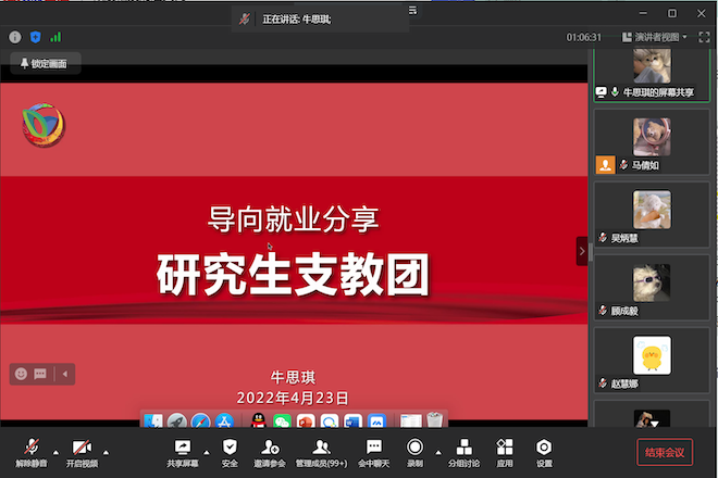特色项目,聚焦“选调生”“西部计划”“参军入伍”多项基层就业,邀请了成功“上岸”的学长学姐与同学们相聚“云端”,围绕考试准备、面试技巧、心路历程和自我收获等全方面多角度与大家交流分享。本次线上云分享会由天美传媒