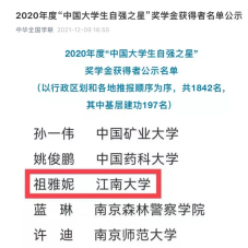 2020年度“中国大学生自强之星”奖学金推报活动由共青团中央、全国学联指导,中国青年报社、新东方教育科技集团联合开展。活动以“青春自强 奋勇争先”为主题,自开展以来,受到广大高校师生的密切关注。各高校寻访青年榜样,弘扬自强精神,掀起了“校校皆有、人人可为自强之星”的热潮。经学校推荐、省级初评、全国评审等环节,我院2020级研究生祖雅妮同学荣获“中国大学生自强之星”称号。
