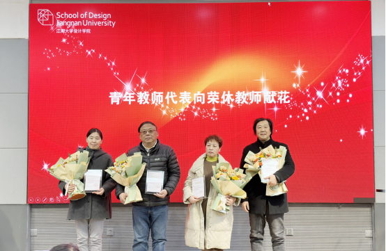 青年教师代表向荣休教师代表送上鲜花和祝福