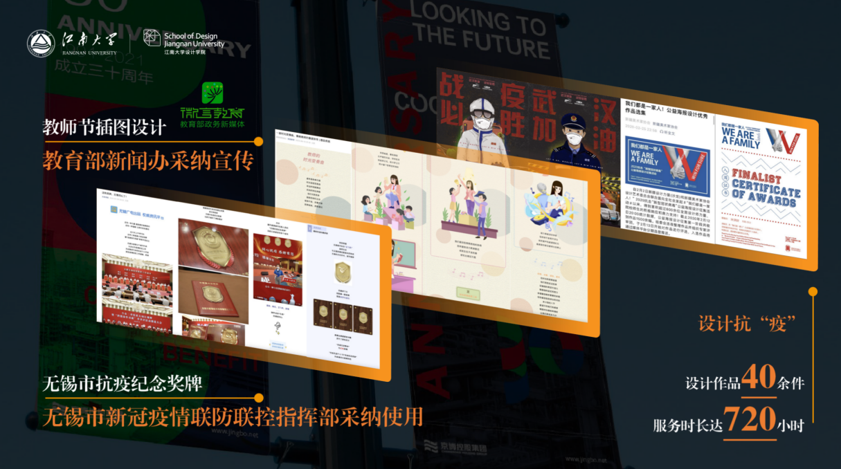 用设计赋能社会发展。在导师的指导下他积极参与纵向课题与横向实践。2021年参与国家社科基金艺术学项目,2024年参与国家社科基金艺术学重大项目子课题,以创新求突围。他设计的无锡市抗疫金纪念奖牌被无锡市新冠疫情联防联控指挥部采纳,绘制的教师节插图被教育部新闻办宣传,制作的京博控股集团的品牌形象、香港江苏社团慈善基金有限公司的标识设计以及无锡市国际志愿服务团标识设计也均被采纳。
