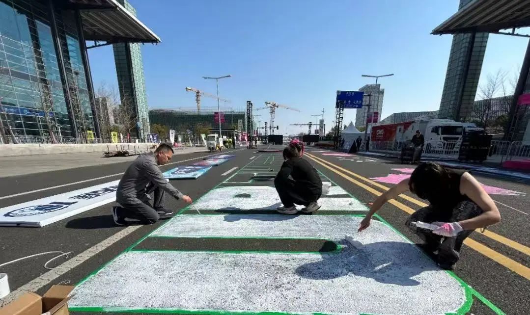 作为本次无锡马拉松亮点之一,100米冲刺赛道的地面彩绘,由天美传媒