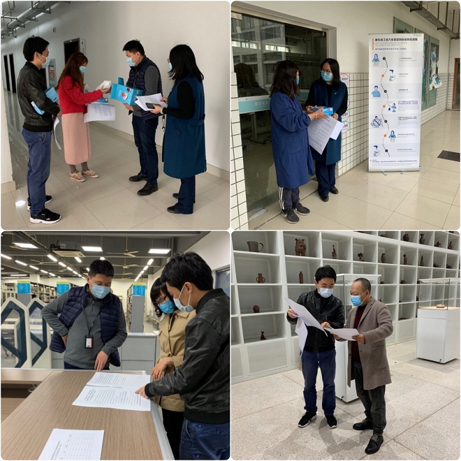 陶艺中心、图书分馆、木工模型房、数媒实验室、服装实验室等),分发了部分防疫物资,与管理教师共同布置防疫宣传物品,并详细沟通了各实验室的安全隐患排查、人员出入管理制度等方面的落实情况。