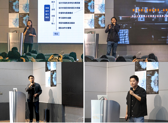 随后,阿里巴巴大淘系设计资深体验专家飞飞以闲鱼为例,为同学们详细讲解了从视觉设计到体验设计的思维转化,以及面对用户需求和产品开发应该如何切入。她以“全链路思维”为中心,强调要“让商业美而简单”。而阿里云设计中心高级体验设计专家小民为同学们讲解了“中后台”体验设计的概念,并从产品体验的多维度量等方面进行了详细分享。最后,就职于阿里巴巴设计部门的两位校友——纸盒和闻阅,分别分享了各自在阿里巴巴这些年如何成为优秀设计师的成长经历,并介绍了自己形成设计体系化思考的过程。