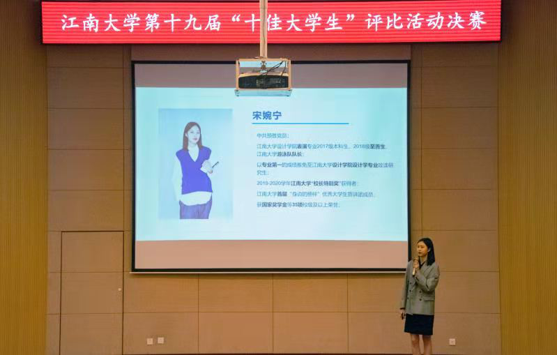 本次评选自11月开始,全校同学通过院荐和自荐两种方式积极参与评选活动,经过材料审核与线上投票,共15名候选人成功入围决赛。决赛共分为四个部分:选手展示、个人答辩、评委老师与大众评审打分以及颁奖典礼。我院宋婉宁同学在风采展示和个人答辩环节分享了自身经历和宝贵感悟。她表示无论严寒酷暑,春夏秋冬,都会留在学校训练,因为她坚信凡事预则立,不预则废。自2017年加入校游泳队以来,三年里进行了近2000小时、1920公里的水下训练,代表学校参加了四项国家级、一项省级比赛,共斩获一金九银三铜的战绩。此外,对待专业学习她也严谨认真,连续三年成绩保持专业第一,获校长特别奖、国家奖学金、优秀大学生宣讲团成员等35项校级及以上荣誉。目前已保送到我校设计学(服装设计方向)专业攻读硕士研究生。