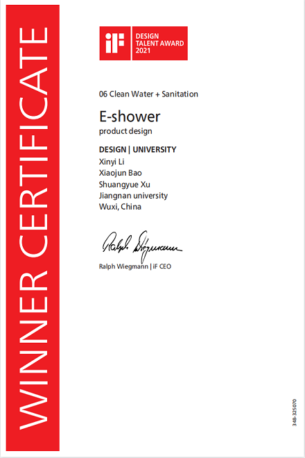 鲍懿喜教授、巩淼森副教授共同指导,2019级研究生李欣怡、包啸君、许双月设计的作品《E-shower》斩获2021年iF设计新秀奖(iF Design Talent Award,天美传媒