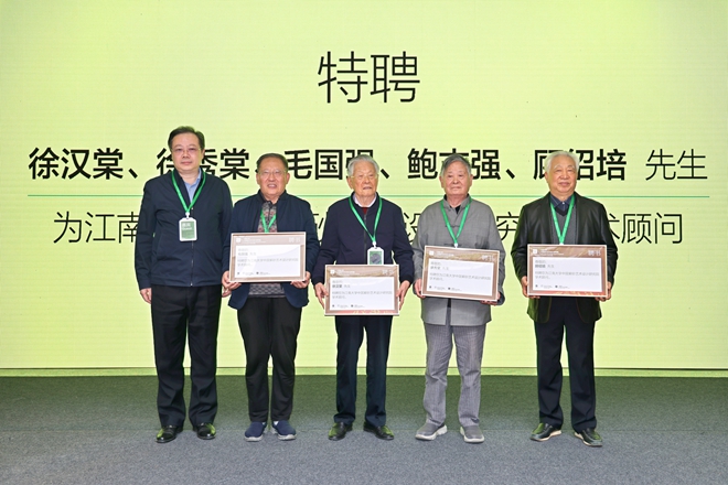 中国紫砂艺术设计研究院院长王峰教授上台受牌。活动现场举行了研究院名誉院长和学术顾问聘任仪式,朱庆葆分别为到场的徐汉棠、徐秀棠、毛国强、顾绍培等四位国家级工艺大师颁发了研究院学术顾问聘书。
