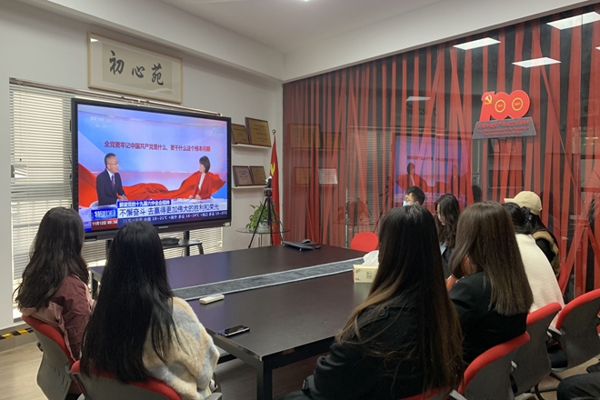 组织师生党员和入党积极分子在党员之家“初心苑”和B304会议室集中收看新闻发布会。全体师生通过线上线下,听取了全会报告,热议十九届六中全会召开,纷纷表示要更加坚定自觉践行初心使命,更好传承弘扬伟大建党精神,以更加昂扬的姿态奋进新征程、建功新时代。