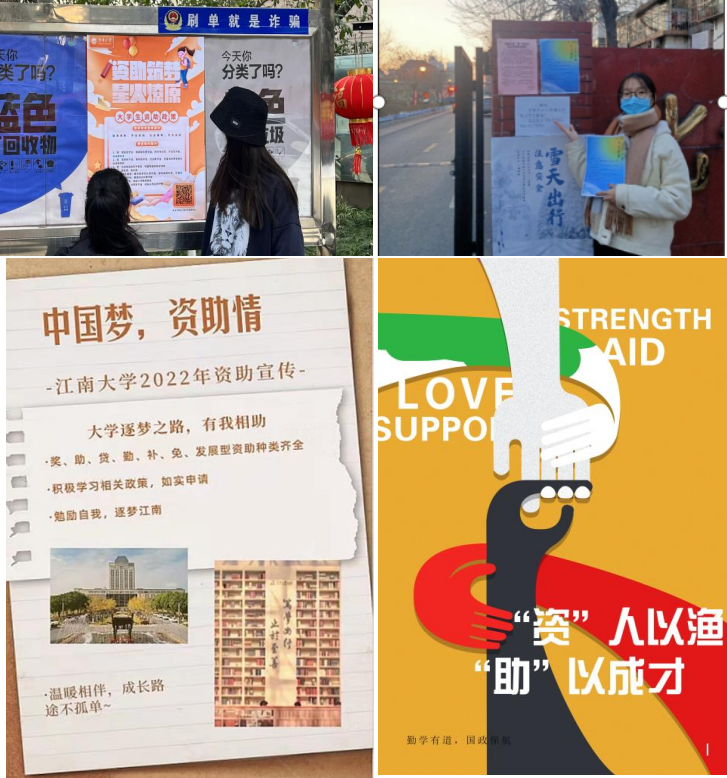 王心怡、徐舒简等同学自主设计宣传海报,进行资助政策的宣传和普及,在个人自媒体空间发布线上宣传视频;林隆隆、陈梦圆等同学采用海报、书法等生动活泼的形式宣传资助政策。设计的海报主体由四只手构成,黑色的手象征处于困难急需帮助的同学,红色的手环绕其外,象征着国家与相关政策对困难学生的保驾护航,灰色的手代表社会大众对其的关切与支持,绿色的手代表学校为学生开辟的绿色通道,背景以黄色为主,深切祝愿在大家的帮助下,每个同学都能拥有光明的未来。