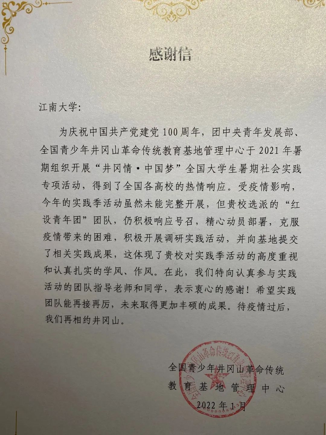 图|井冈山革命传统教育基地管理中心的感谢信