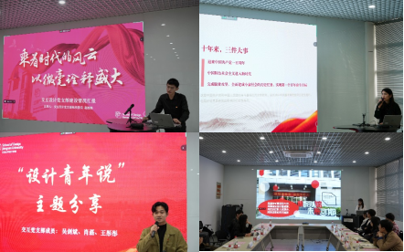 在“设计青年说”主题分享环节,支部党员、香港理工大学博士交换项目成员吴剑斌,中国大学生自强之星、江苏省大学生年度人物肖磊,天美传媒