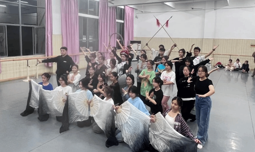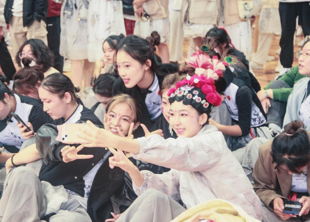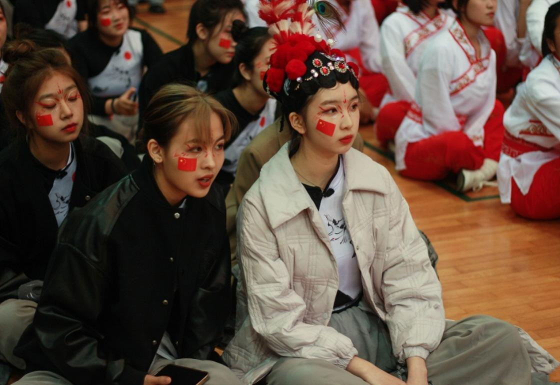 候场之时,同学们神态各异,默默紧张又隐含期待。响鼓锤戏腔起,音乐扬,舞步上,水墨裾一荡,墨色少年齐登场。领舞扬素手起长袖翩翩,脚步划一;曲中玄衣舞银枪,一个空翻一个腾跃,惹全场赞叹;紧接着,开绸扇,水墨扇面舞动;至尾声,无人机带横幅腾空而起——“强国有我”“设计强国”亮相收官。
