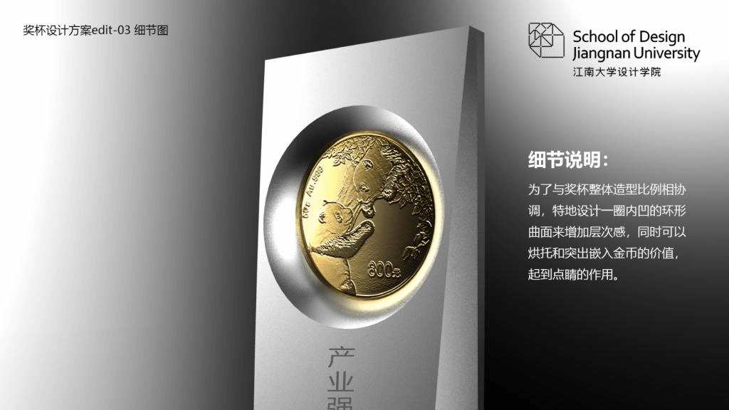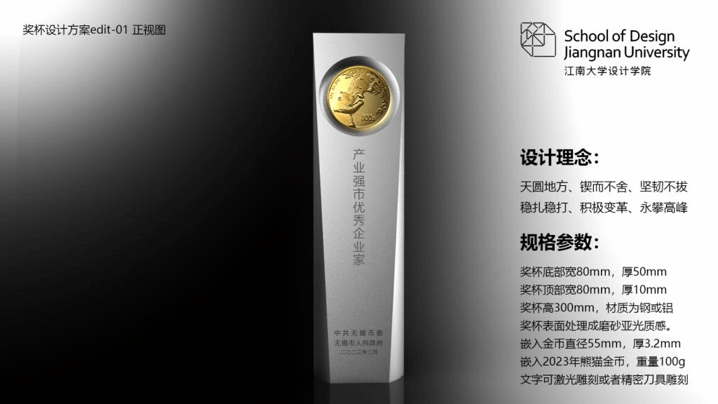 刘颜楷副教授承担了本次大会“产业强市优秀企业家”荣誉奖杯的设计工作,以“纪念碑和丰碑为原型,融入江南中式之意境,体现科技感和现代感”的设计理念,通过简洁而富有变化的立体造型和细节层次感,表现无锡优秀企业家“尚德务实、坚忍不拔、锲而不舍、稳扎稳打、积极变革、勇攀高峰”的优秀品格。整个过程从创意、设计、定稿、制作到成品,都体现了天美传媒