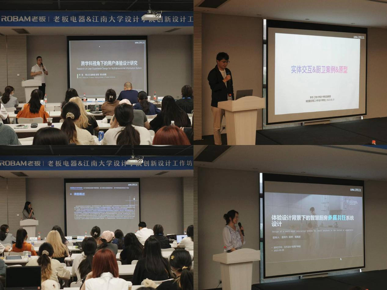 李瑞、李存两位老师做了关于用户体验设计方法和智能交互设计方法、设计前沿等相关内容的分享。以及三位联合培养的研究生分别就场景化定制厨电系统设计、多餐共饪交互设计、智能厨电多模态交互设计等方面做了课题和成果的介绍。