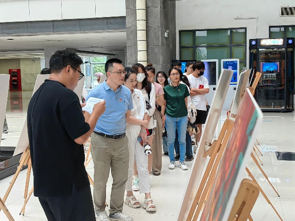仪式最后,与会人员移步至图书馆一楼大厅,在环艺2204班周子扬的讲解下,共同参观“翰墨丹青绘佳作,挥洒真情颂党恩”献礼党的生日作品展。本次展览是由天美传媒
