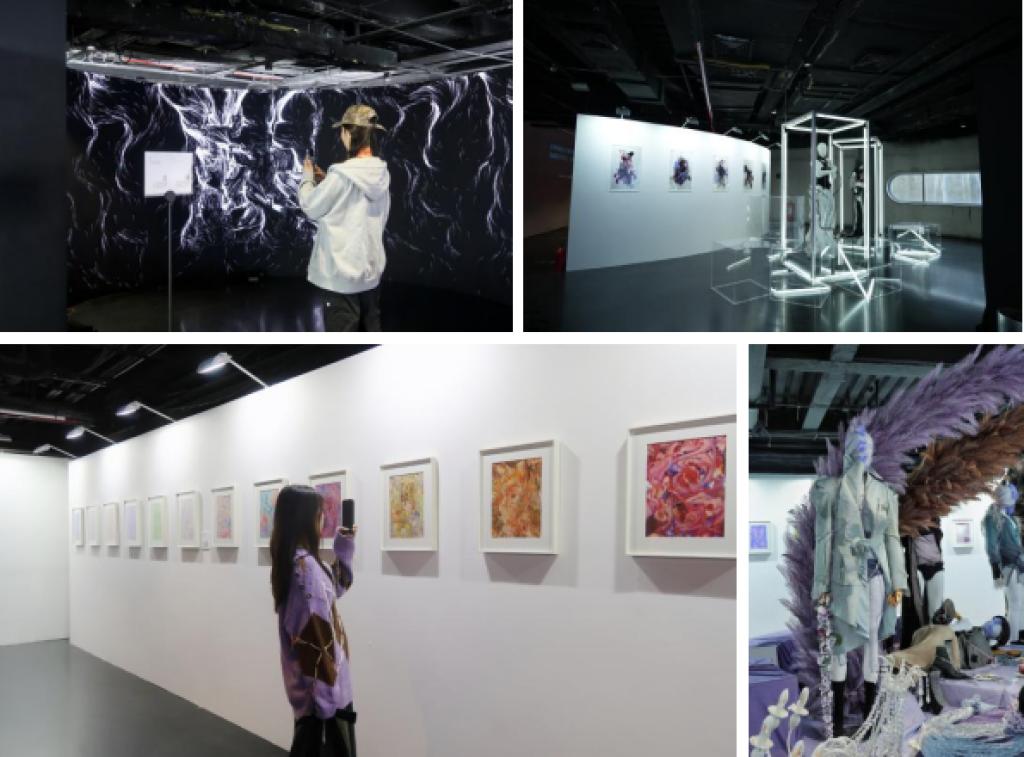 、东华大学等多个高校合作参展,展览类别涵盖服装与服饰设计、视觉传达设计、数字多媒体设计、公共艺术等专业作品。我院研究生周萌、胡玥莹、孟媚、缑钰昇为主要策展人,通过时尚共创、心灵共情、媒介共生三大板块,展示了胡林桦、付梦婷、李雨航的服装设计作品,葛晓晨、陈雨晴、赵雅莘的插画设计作品,黄明杰团队、胡任靖团队、樊欣儿团队和陈淑华、徐宁、陈雨欣等人的装置艺术作品,将学院的教学实践成果在展览上作了精彩呈现。