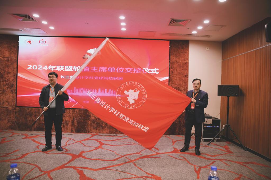 年会还进行了2024年联盟轮值主席单位交接仪式。合肥工业大学艺术学院党委书记孙建海从苏州大学艺术学院党委书记宁正法手中接过联盟会旗帜。