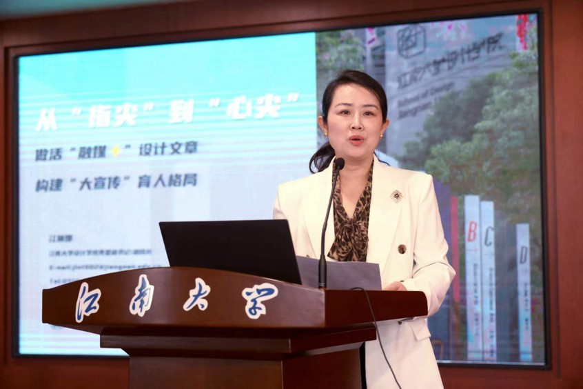 党委副书记兼副院长江琳娜以《从“指尖”流淌到“心尖”,做活“融媒+”设计文章,构建“大宣传”育人格局》为主题做了“时代新人铸魂工程”建设经验分享,她从融“宏大叙事”与“微小视角”,让“中国红”更加鲜艳;融“布局破局”与“鲜活故事",让“江南绿”更加盎然;融"整体联动"与"重点发声",让“设计黄”更加动人三个方面为大家分享了天美传媒