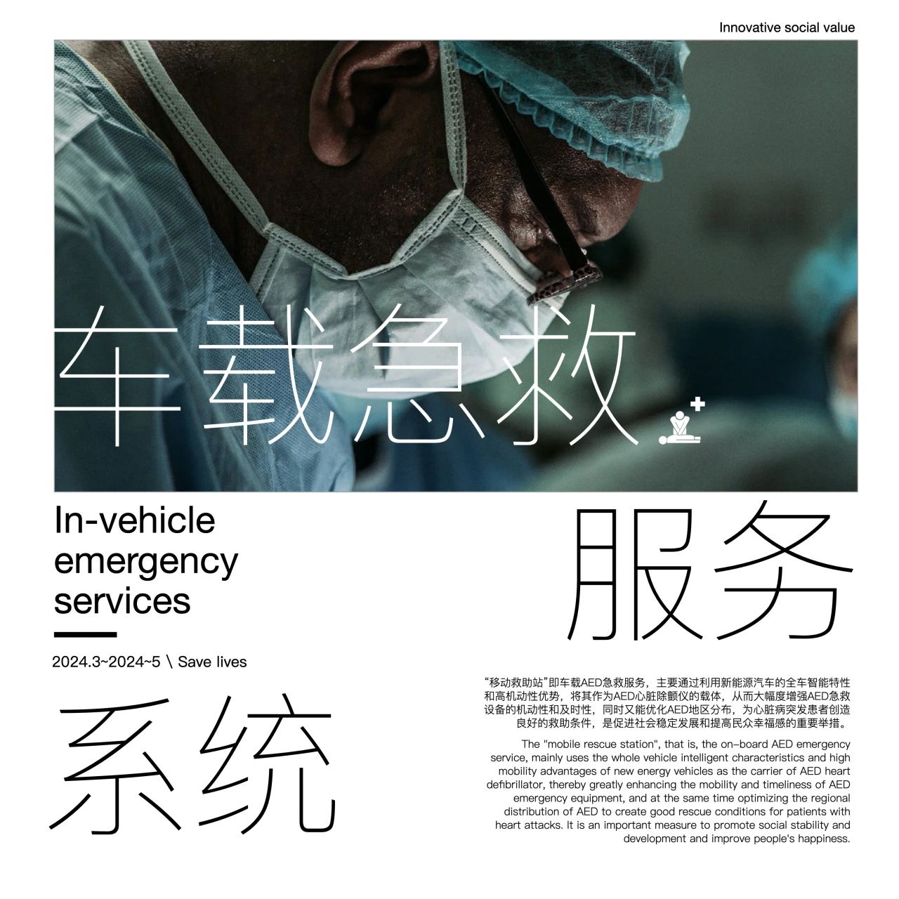 优秀奖作品——“车载急救服务设计”主要利用新能源汽车的全车智能特性和高机动性优势,将其作为AED心脏除颤仪的载体。将AED心脏除颤器装配于车后右侧,在应对出现心脏病突发情况时通过车主或救助人员与急救热线人员的服务联系,快速定位到达事故发生现场完成救援。同时aed以车为载体存在在城市的角角落落,在有患者继续aed时可以定位到最近装载aed的车型上。通过该服务从而大幅度增强AED急救设备的机动性和及时性,同时又能优化AED地区分布,为心脏病突发患者创造良好的救助条件,是促进社会稳定发展和提高民众幸福感的重要举措。同时对于企业,可以提升大众安全感、车主自豪感、品牌社会责任感以及消费者对于品牌的认可程度有开创性作用。