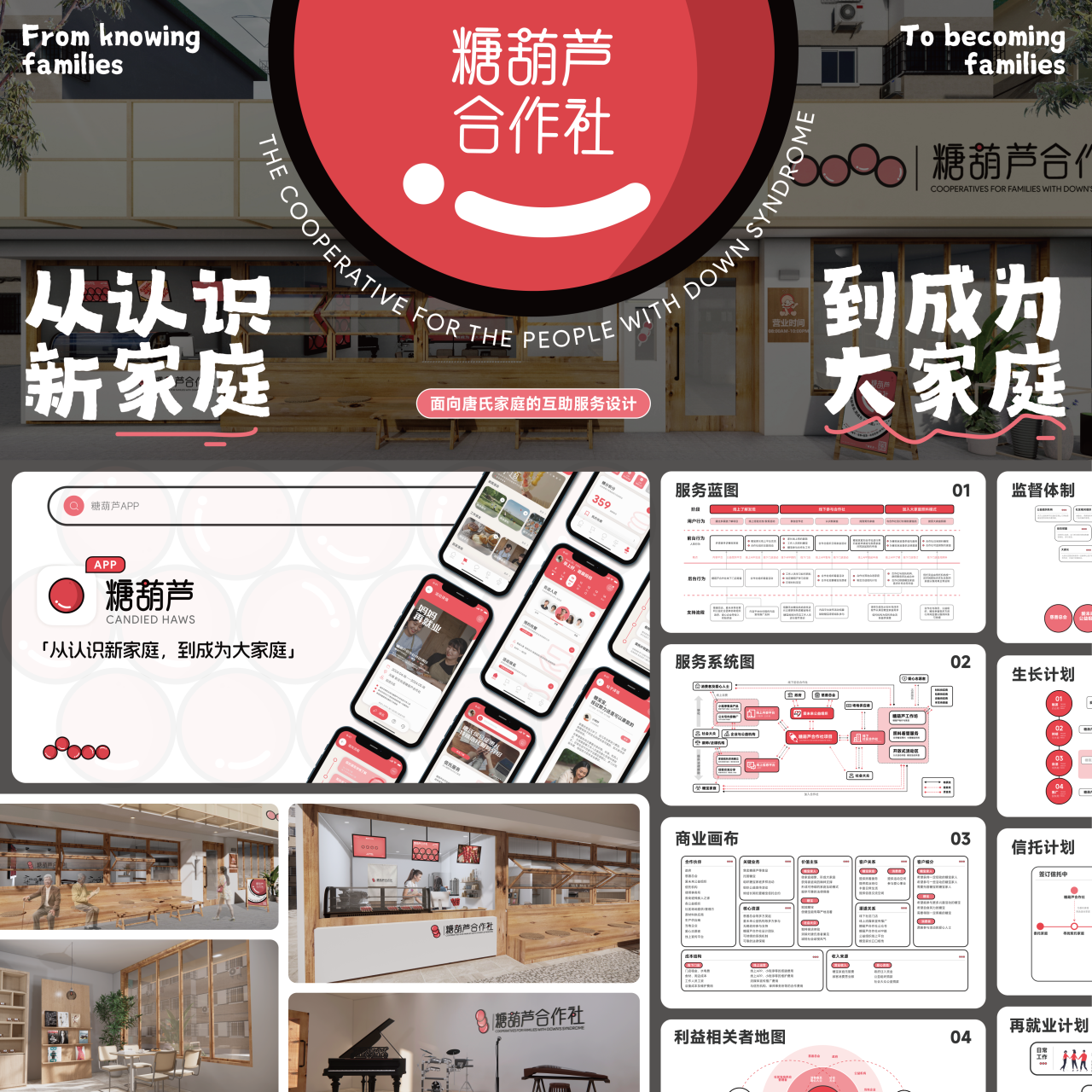 银奖作品——“糖葫芦合作社——面向唐氏家庭的互助服务设计”是针对唐氏综合症患者而发起的一个服务设计与社会创新项目,这个项目基于一个棘手的社会问题,即当父母离去时,唐氏综合症患儿应该如何生活这一问题。项目通过赋能家庭间互助的力量,打造可持续的未来大家庭互助模式来解决患儿未来生活问题,致力于为糖宝家庭打造一个“线上+线下”的互助平台,让每个家庭都能找到彼此的共鸣与支持,让不同家庭一起携手前行。同时,我们也希望建立糖宝群体与社会的连接,让更多糖宝被社会看见,从而减少社会对糖宝群体的偏见。让糖宝家庭与社会大众共同创造由善与爱编织而成的糖宝大家庭。评委点评到,“糖葫芦”是一个针对唐氏综合症家庭互助发起的服务设计与社会创新项目。项目的亮点在于其长远及可持续的服务目标,以及包括了人际触点(糖宝家庭)数字触点(线上 APP)和物理触点(线下社区合作社)在内的系统化设计。“大家庭照料”与“小家庭互助”相得益彰,其中“日间托管与工作”“妈妈再就业”“信托签订”等服务内容的规划与设计切实地解决了糖宝家庭照护过程中的痛点。希望该项目能够有进一步落地实施、验证和迭代的机会,这也是社会创新服务设计项目需要面临的更大挑战。