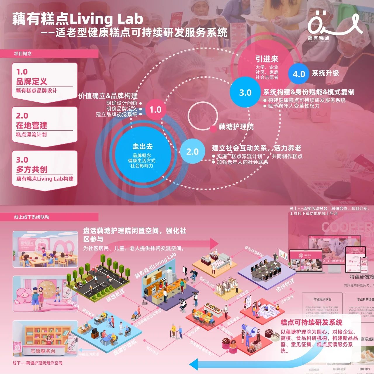 优秀奖作品——“藕有糕点 Living Lab一适老型健康糕点可持续研发服务系统”致力于联结多方利益相关者,构建以藕塘护理院为圆心、覆盖全社会的适老型健康糕点可持续研发服务系统,通过生活实验室合作网络传播健康饮食理念。以服务设计与社会创新设计介入,帮助藕塘护理院老人获得更健康快乐、有活力的养老生活。藕有糕点Living Lab的搭建分为三个阶段,1.0阶段,通过四时养生理念打造藕有糕点品牌和四款互动式糕点,宣传“健康-Healthy、愉悦-Happy、治愈-Healable”的3H理念。2.0阶段,策划“糕点漂流计划”,以饮食社交的形式丰富护理院老人的生活并强化其社会链接。3.0阶段将与多方利益相关者共建藕有糕点Living Lab,为护理院老人赋能,将老人身份由被照料者转换为健康糕点品鉴师,为更多相关食品研发机构提供糕点反馈服务。