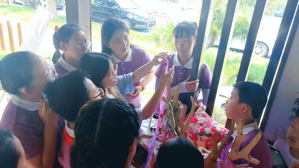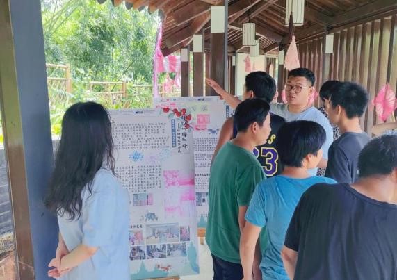8月14日上午,烈日当空,“相约‘梅’好”实践团成员们顶着34℃的高温天气在古竹诗廊中布置展览,利用诗廊得天独厚的蜿蜒设计将展板错落摆放,与当地特产、扎染作品、与文创周边实物相得益彰。粉色的扎染布料悬挂在鱼鳞般的瓦片下,阳光透过长廊外的竹子缝隙中洒下,照在美丽的扎染布料上,微风拂过,竹影若隐若现,为整座长廊增添了一份别样的意境。下午,“杨梅古韵”展览正式开始,展览分为“古竹时光”“杨‘梅’吐气”“扎染生花”“文创周边”四个主题。一走进长廊,好似穿越到了一个由古竹文化与艺术创意编织的梦幻世界,每一块展板都是一处充满奇思妙想的空间,有无数美妙的惊喜等待发现。这一创意长廊也吸引了很多居民和小孩子,实践团成员们生动形象地讲解了古竹的历史、杨梅文化与扎染艺术的力量,分享了扎染过程中的趣事,其中,以天然竹林为背景的杨梅打卡区吸引了大家的驻足拍照。“哇,真的好美呀”、“今天真的学到了不少知识”“谢谢天美传媒