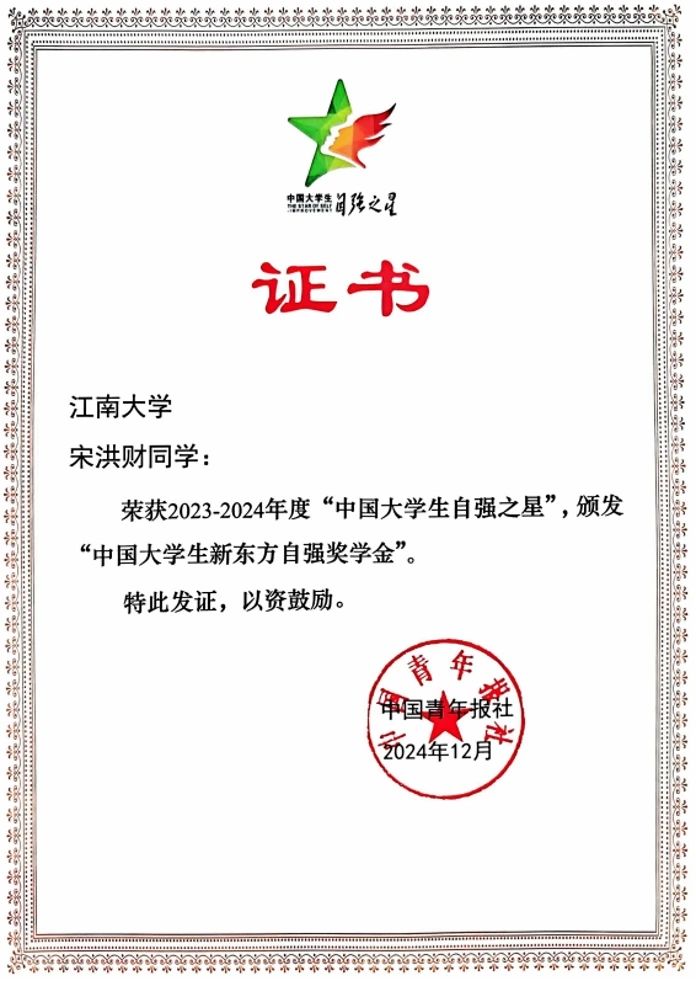 2024级博士生宋洪财荣获2023-2024年度“中国大学生自强之星”荣誉称号和奖学金。