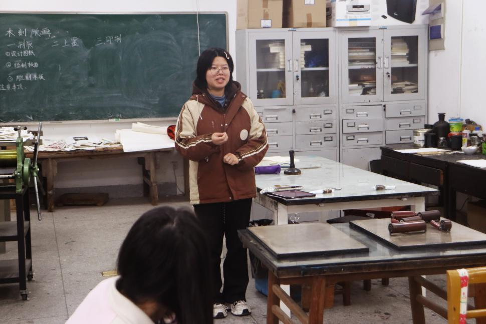 紧接着,美术专业2101班的曹数学长现场展示了版画创作全过程。他手中的刻刀犹如灵动的画笔,在木板上翩翩起舞,不一会儿,一幅精美的作品便在木板下完美呈现。同学们围在学长身边,全神贯注,不放过聆听任何一个关键步骤,现场气氛热烈而融洽。