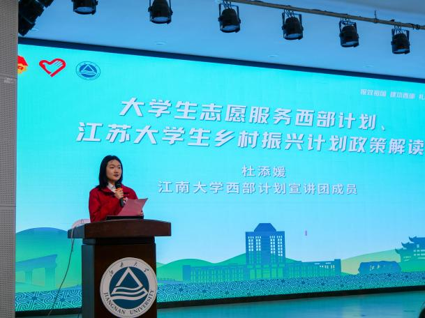宣讲环节中,西部计划宣讲团成员杜添媛系统解读了2025年度西部计划政策要点。她从项目背景、运行机制、招募标准、服务领域等维度展开政策宣讲,重点阐释了国家基层服务项目的顶层设计与实施路径,详细说明志愿者招募选拔流程及服务保障机制。江阴市志愿服务乡村振兴计划专员朱昱飞结合江阴宣传片,从多维度展示了宜兴的城市特色与乡村发展图景。他围绕乡村振兴专项计划的岗位设置、服务流程、保障机制及职业发展通道进行系统讲解,并针对岗位匹配度、服务周期等关键问题提供政策咨询。