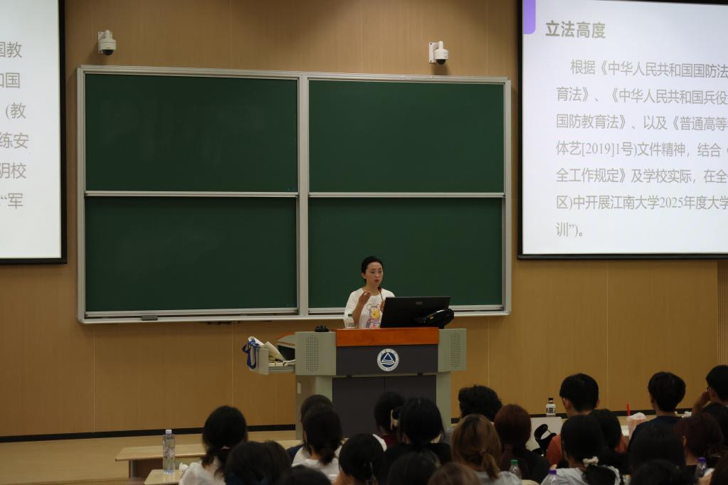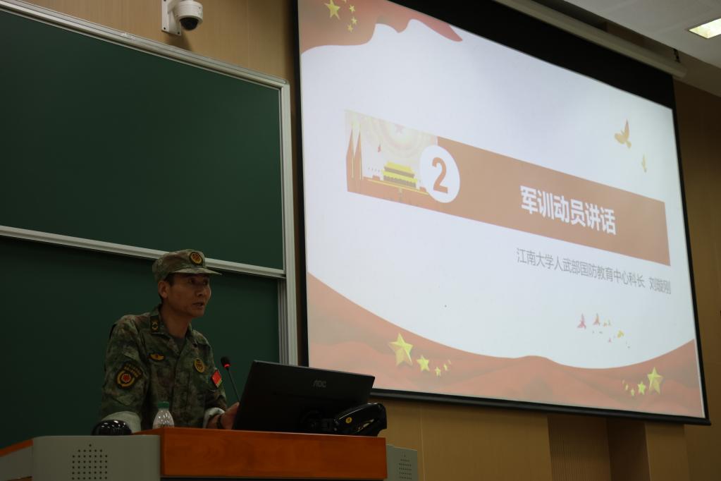 人武部国防教育中心刘璇刚科长作动员讲话。从国防意义到个人成长,他鼓励同学们在训练中锤炼意志、增强体魄,培养爱国主义精神和集体观念,为大学生活打下坚实基础。