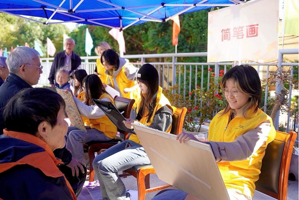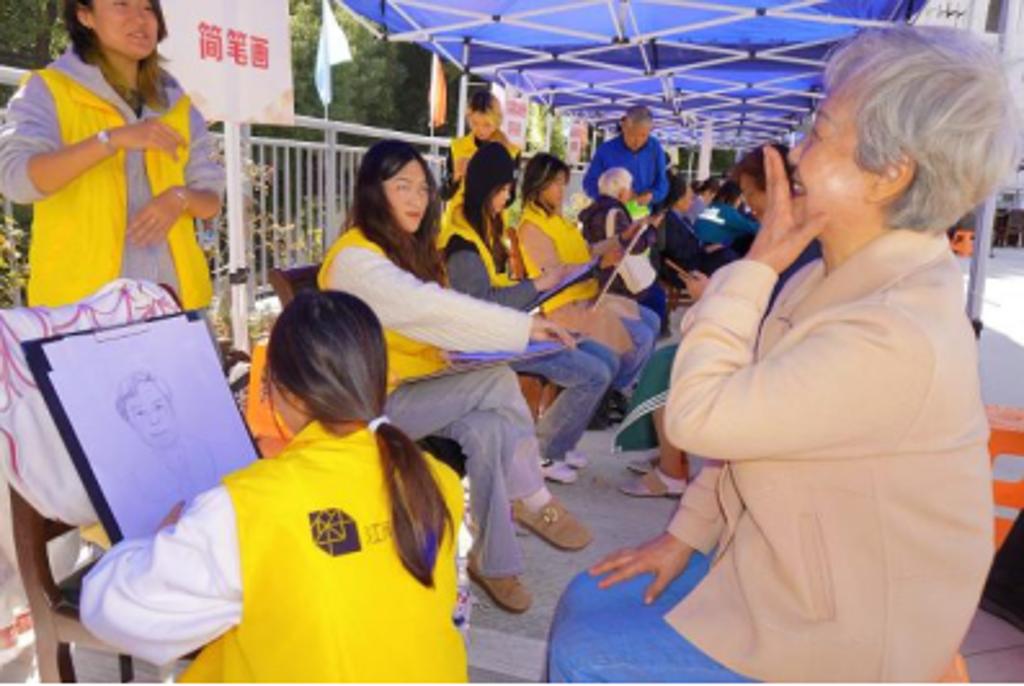 “益”起设计志愿服务团开展“丹桂飘香绘温情”百幅肖像志愿活动,用20分钟定格60年光阴,以专业所学向学校老一辈建设者致以节日敬意。