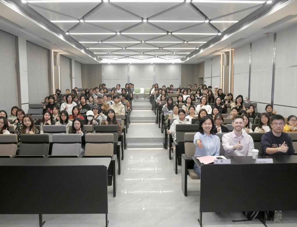 合作的“1+1+1”硕士双学位联合培养项目。他详细说明该项目的培养模式、对接的专业方向、录取要求、申请流程及截止日期,并特别强调为我院成功申请该项目的学生,提供高达20%的学费减免奖学金这一重磅福利。互动环节,在场学生就专业课程细节、住宿生活、职业发展等关心的问题踊跃提问,Jason先生一一给予细致解答,现场交流热烈。