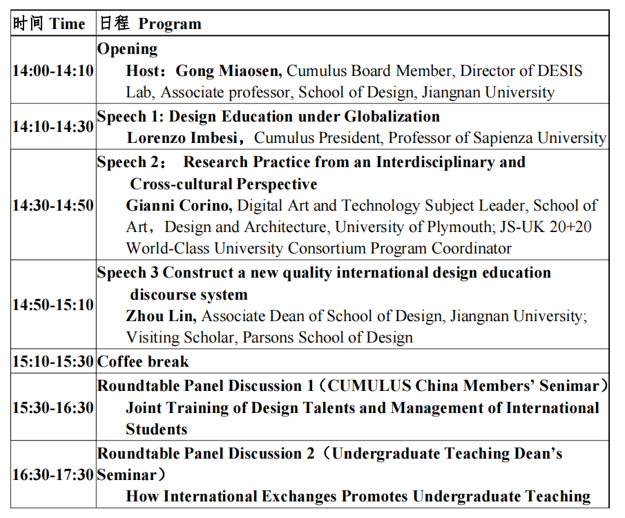 China's design education has developed with the tide of globalization. On the one hand, contemporary design education in China is the product of international cultural exchanges, and on the other hand, economic globalization is the driving force for the vigorous development of design education. Therefore, design and design education have the essential characteristics of globalization, and the tide of globalization will inevitably promote the surge of design education. The purpose of this forum is to discuss how design education shall face the challenges and opportunities in the new wave of globalization: how to effectively use international resources and cooperation, how to adhere to the core values and spirit of design education, and how to take into account traditional cultural heritage and cross-cultural export ability in design teaching. As one of the first batch of units to join the Cumulus Alliance in China and the current Cumulus Executive Committee, the School of Design at Jiangnan University hopes to take the conference as an opportunity to discuss design education under the new tide of globalization with Cumulus members and partners across the globe.