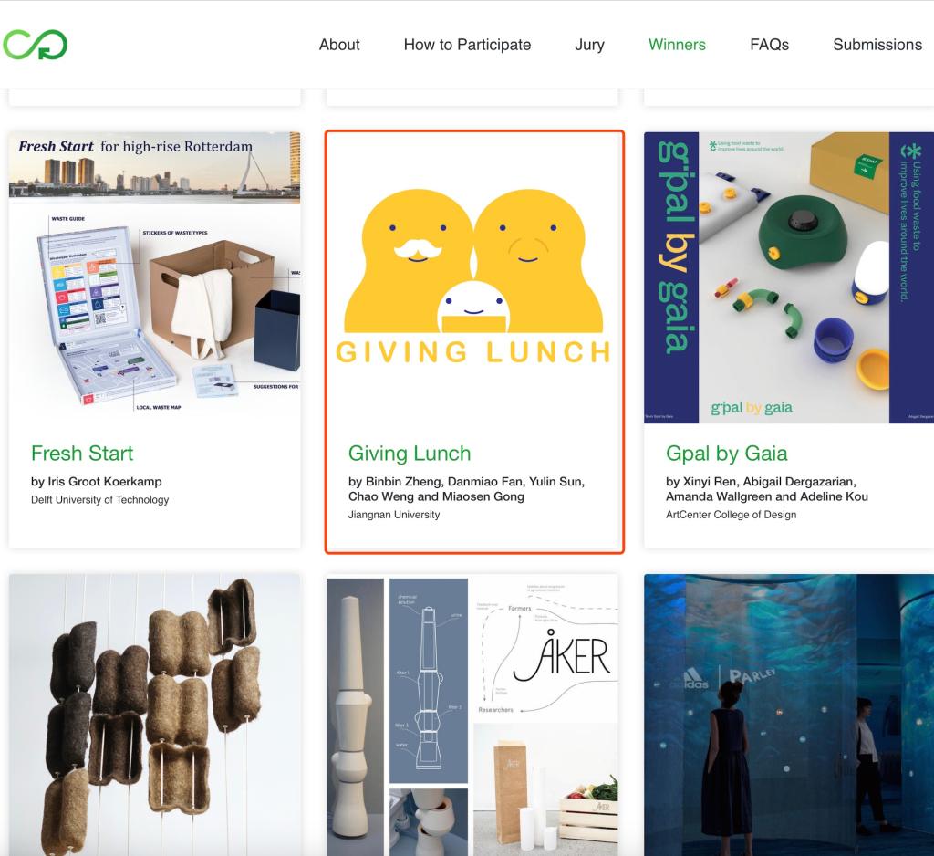 The Cumulus Green 2020: For A New Circular Economy competition announced the list of winners recently, and Jiangnan students’ work titled Giving Lunch co-worked by Binbin Deng, Danmiao Fan, Yulin Sun, Chao Weng won the Honorary Mention Prize, one of the 50 winners out of the total of 683 submissions poured in from 163 universities across 44 countries. (for details, see: //cumulusgreen.org/winners/)