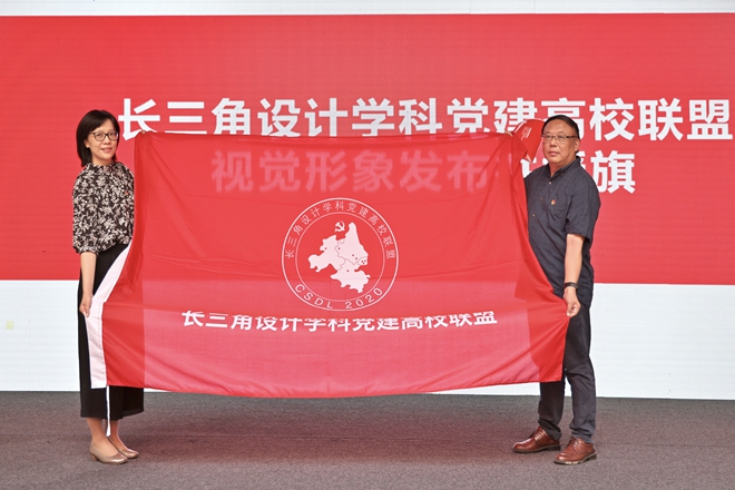 活动现场,长三角设计学科党建高校联盟视觉形象发布,联盟视觉形象以简化的长三角地图为主要图形,将现有八个高校在地图中以圆点形式展现,以党徽为中心,以党的红色为主色调,集合联盟全称汉字及拼音首字母CSDL等为主要视觉内容共同组成。张影陆为2021年联盟轮值主席单位天美传媒