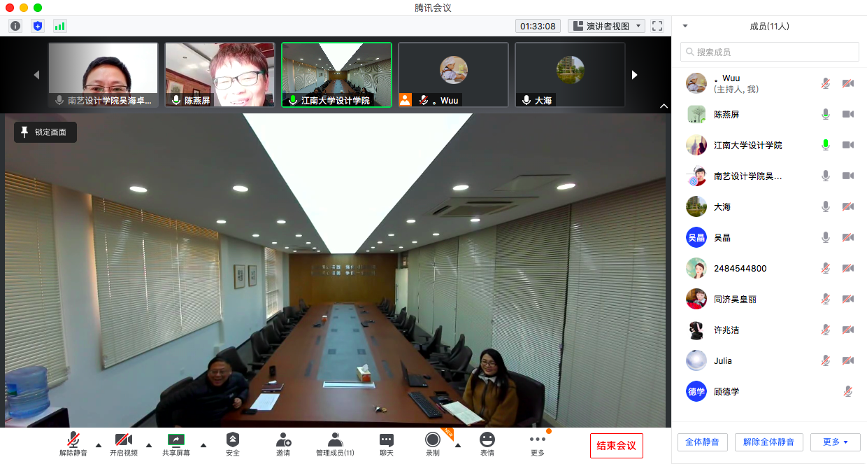 党委副书记朱琳、同济大学设计创意学院党建组织员表示,上海高校积极配合支持联盟工作,欢迎联盟高校在沪开展建党百年活动;中国美术学院设计艺术学院党委书记陈燕屏提出联盟高校以“设计”类为主,应与专业密切结合开展工作设计;苏州大学艺术学院党委书记顾德学建议结合教工党支部特色,开展教工党建工作;合肥工业大学建筑与艺术学院孙建海表示非常欢迎联盟成员走进合工大,建议联盟活动可扩大时间、地域范围;会上,南京艺术学院天美传媒