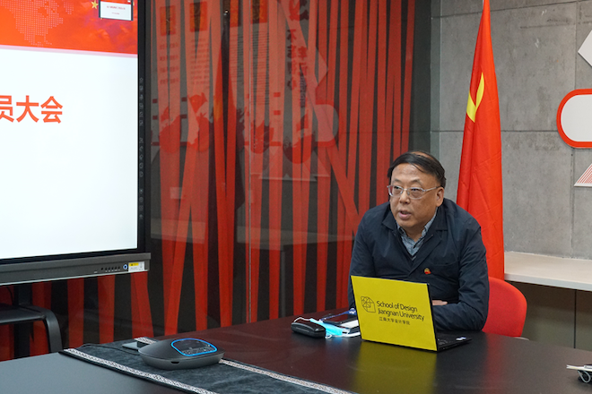 最后,邱建平书记给全体党员上了一堂以“一片丹心坚守初心 江南设计践行使命”为题的党课。他从中国战”疫”--核心指挥引领、“艺”起战“疫”--设计有责担当、设计未来--争创一流学科三个方面阐述了疫情发生以来党和国家、学校、学院开展的战“疫”工作。疫情发生以来,党中央高度重视,习近平总书记亲自指挥、亲自部署,主持召开系列专题会议,发表一系列重要讲话,作出重要指示、批示,在疫情防控关键时刻给予精准有力指导,充分体现了以习近平同志为核心的党中央对人民生命安全和身体健康的高度负责的态度。当前防控工作成效巨大,彰显了中国共产党领导和中国特色社会主义制度的显著优势。邱建平认为中国战“疫”的整个战斗过程给每位共产党员上了一堂深刻的新时代版《共产党宣言》党课。这段时间以来,学院党委深入学习领会、贯彻落实习近平总书记系列重要讲话精神;认真落实学校有关工作部署要求,坚持理论学习不停电、中心任务不停步、立德树人不停摆,交出一份设计“战疫”合格卷。邱书记特别强调,一名党员一面鲜红旗帜,一个支部一座战斗堡垒,号召全院教工党员切实提高政治站位,在战“疫”面前彰显党员使命担当,做好抗疫防疫工作的同时坚持立德树人方针,抓好教学工作,积极投身科研工作,主动参加学院的活动等,充分展示设院党员的亮丽风采与精神风貌,以实际行动践行共产党员的初心使命。最后,面对当前的“疫”情,邱建平书记以电影《红岩》主题曲“红梅赞”中歌词“红岩上红梅开,千里冰霜脚下踩,三九严寒何所惧,一片丹心向阳开;红梅花儿开,朵朵放光彩,昂首怒放花万朵,香飘云天外,唤醒百花齐开放,高歌欢庆新春来”与教工党员们共勉。