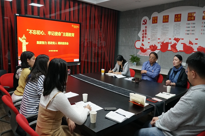 在党员活动室“初心苑”召开“不忘初心、牢记使命”主题教育系列活动——辅导员调研座谈会。天美传媒