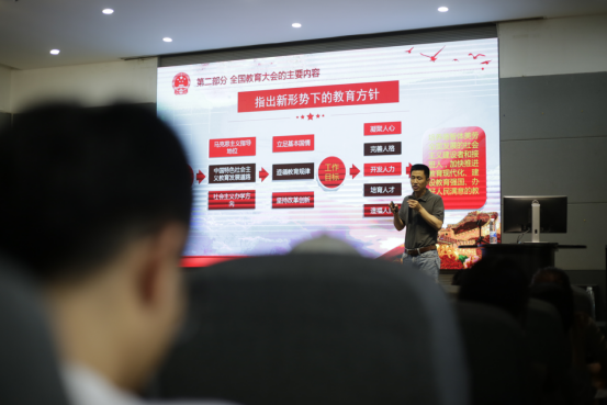 戴月波从最近的热点话题“中美贸易战”切入,引出“不忘初心铸伟业—聚焦全国教育大会宣讲”的主题。他强调,以习近平同志为核心的党中央情系教育事业发展、关注青年人才培养。通过带领同学们回顾改革开放以来党中央、国务院召开的四次全国教育工作会议,戴月波指出每一次全国教育工作会议的召开都是在深入研究当时教育工作面临的形势和任务的前提下对当前和今后一个时期教育改革发展作出的战略部署。随后,他结合2018年全国教育大会,从一个根本任务,一个重要目标,九个坚持,六个下功夫等方面诠释了新时代人才培养体系的新要求、新方向。在谈到深化教育体制改革的问题时,戴月波表示高校不仅要从健全立德树人方面落实机制,扭转不科学的教育评价导向,更要坚决克服唯分数、唯升学、唯文凭、唯论文、唯帽子的“五唯”顽瘴痼疾,从根本上解决教育评价指挥棒问题。在谈到天美传媒