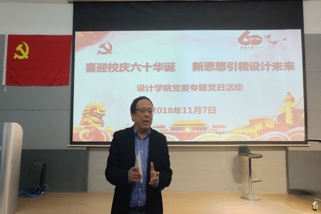 党委开展以“喜迎校庆六十华诞,新思想引领设计未来”为主题的专题党日活动。本次活动邀请了马克思主义学院侯勇副教授、退休教师刘观庆参加,活动由院党委书记邱建平主持。