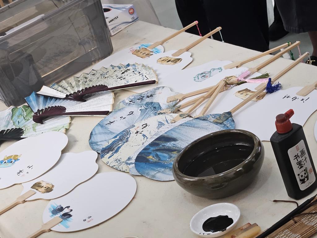 从本科、硕士、博士到专业教师的成长历程。他分享了求学路上的收获与感慨,并强调了理论与实践相结合的重要性,鼓励在座同学们不断创新,引领未来。随后,在辅导员冯志远老师的讲解引导下,在场师生共同进行了“爱在江南”非遗漆扇手工体验活动,从点漆到浸水,师生见证了绚烂的图案在扇面上的产生过程。陈校长和在场师生制成了多件精美的漆扇作品,深刻感受到传统手作艺术的独特魅力和文化底蕴。
