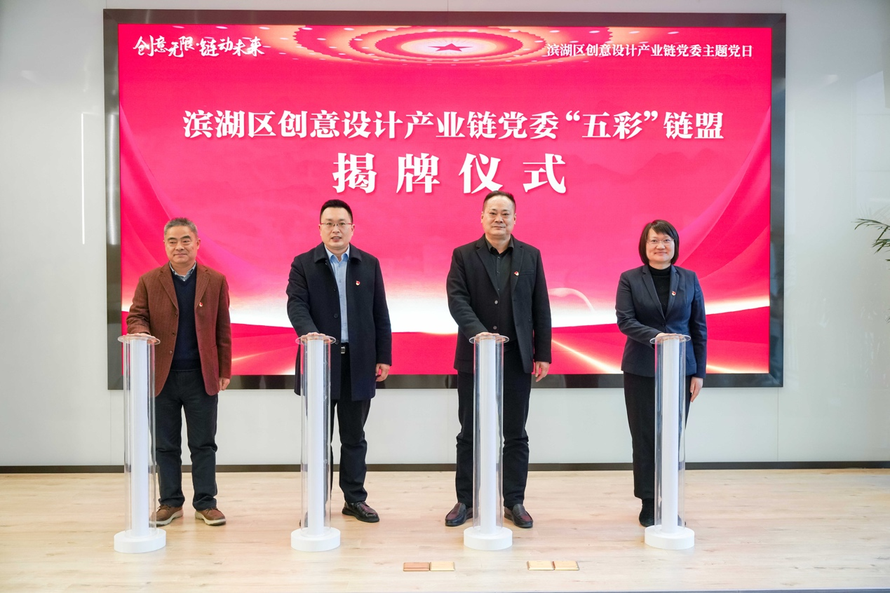 会上,王维青与滨湖区市场监督管理局党委书记、局长王巍,蠡园开发区(蠡园街道)党工委副书记、政协主任李东生,华仁建设集团有限公司党支部书记、董事长袁霞等共同为滨湖区创意设计产业链党委“五彩”链盟揭牌。江琳娜代表天美传媒