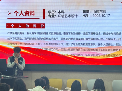 会上,王唯首先介绍了2024下半年拟转正预备党员的相关情况,接着由预备党员依次进行答辩汇报。预备党员们本着实事求是的原则,结合自身经历向党组织汇报了自己在预备考察期内思想、学习和工作等方面的成长与不足之处。他们中有的在本科四年内斩获A、B类设计竞赛奖项20余次,代表学校在国内乃至国际上崭露头角,展现设计风采;有的投身于实践活动,共参加13项校级及以上社会实践活动,并累积志愿时长超380小时,真正走进社会,走近民众;有的曾担任团支书,工作认真负责,高效完成党组织交给的任务,并组织参与社区调查公共服务等10余项活动。他们表示,未来也将继续按照党员的标准严格要求自己,不忘初心、牢记使命,继续在学习、工作和生活中发挥先锋模范作用,为党的事业添砖加瓦,努力做一名优秀的共产党员。