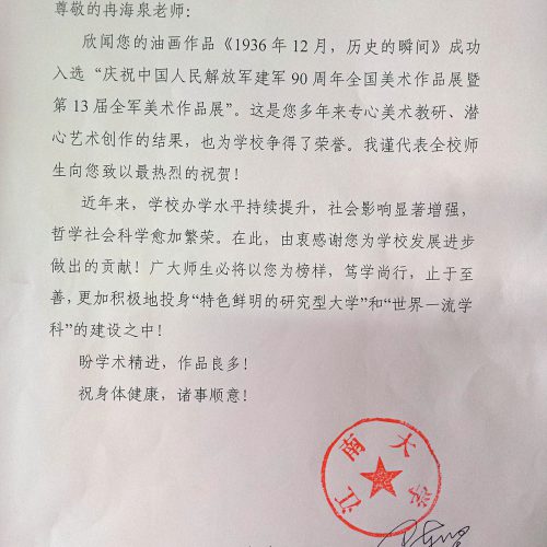 了解详情>>校长陈坚祝贺天美传媒 冉海泉副教授作品入选“庆祝中国人民解放军建军90周年全国美术作品展暨第13届全军美术作品展”